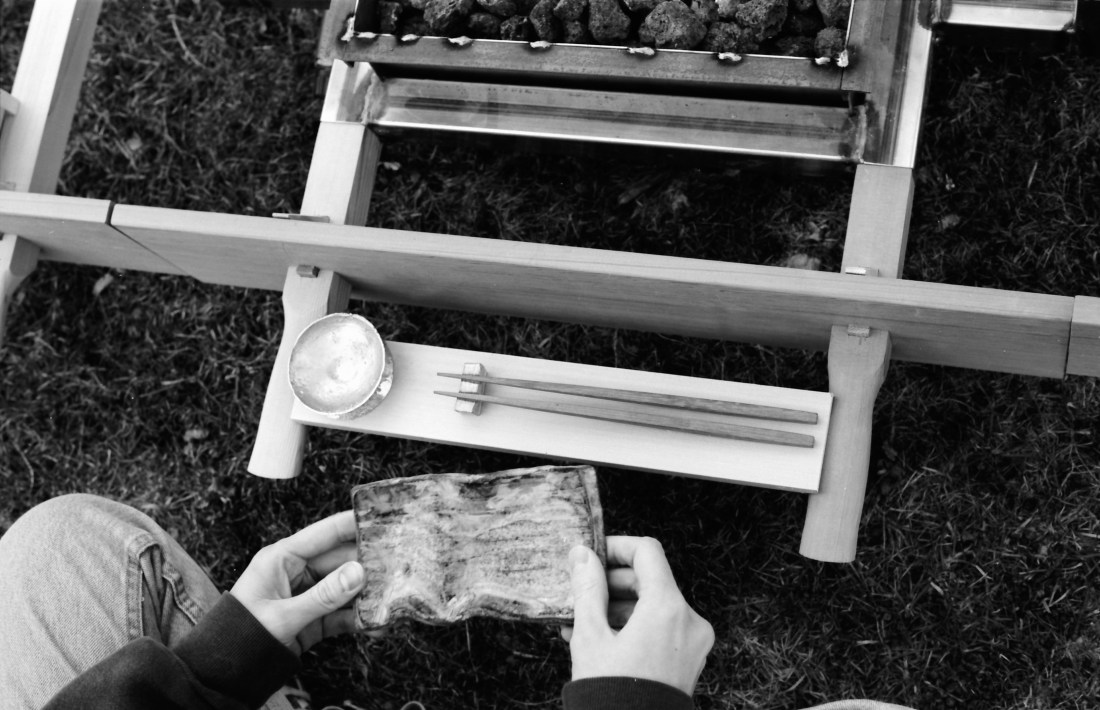Three modules stack for transport, yoked under the carrying beam, and for dining they are separated and from the beam is suspended a kettle, cooking pots, or foods for drying and warming. A steel firebox isolated by heat sinks nestles within a cedar frame constructed using traditional joinery techniques that rely on wedges, friction and precise carpentry; no fasteners, adhesives nor any other connection methods are employed. Custom made ceramic dishes and utensils complete the system, envisioned as a self-contained outdoor dining experience.