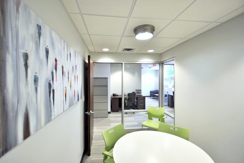 Natural light from north-facing windows is balanced with high-reflectance-value interior finishes to achieve a contemporary feeling with corporate character. Charcoal-tone trim and mahogany-stained wood add contrast and formality to the overall palette without diminishing the airiness of the space.